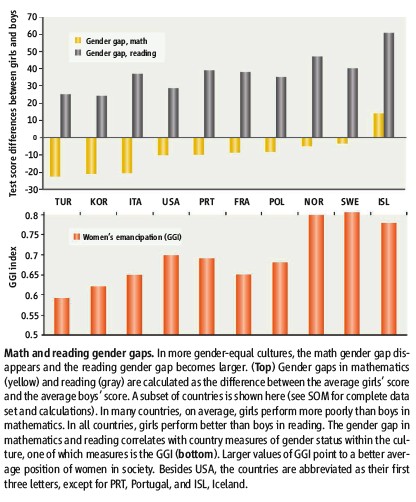 In fact, the story of the change in the ‘math gap’ in the United States seems to mirror a pattern that is also seen across cultures: changing status of women seems to correlate pretty strongly with the math gap. When women are treated more equally, it shows up in girls’ math scores. Studies of students in different societies show that the difference between boys’ and girls’ averages is not constant, and can be reversed. The Economist recently ran a story on gender achievement gaps in different places based on another Science report by Luigi Guiso of the European University Institute in Florence and colleagues: Diversity: Culture, Gender, and Math.