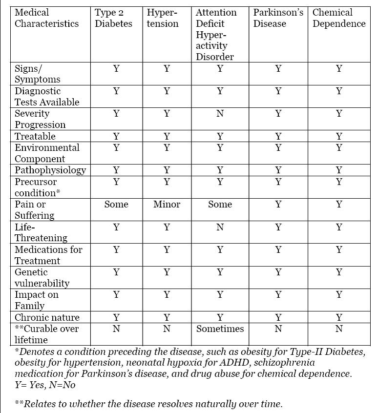 In his book Erickson produces a table (p. 11), which we have included below, containing five diseases and 14 medical characteristics. The five diseases he lists are type 2 Diabetes, hypertension, attention deficit hyperactivity disorder, Parkinson’s disease, and chemical dependence. The table makes it clear that chemical dependence shares many of the same standard medical symptoms of the other four diseases. This example further shows that chemical dependence should be thought of as a disease, not as a social stigma.