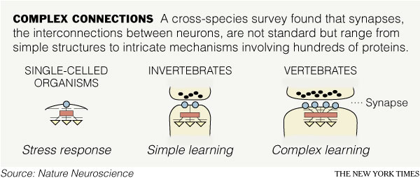 Synapses had been viewed as a standard feature across animal brains. “In fact the synapses get considerably more complex going up the evolutionary scale, Dr. Grant and colleagues reported online Sunday in Nature Neuroscience. In worms and flies, the synapses mediate simple forms of learning, but in higher animals they are built from a much richer array of protein components and conduct complex learning and pattern recognition, Dr. Grant said… ‘From the evolutionary perspective, the big brains of vertebrates not only have more synapses and neurons, but each of these synapses is more powerful — vertebrates have big Internets with big computers and invertebrates have small Internets with small computers’.”
