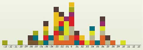 Each square represents a grade level in one of 10 U.S. states. At the center of the chart (the 0 mark), the two genders performed equally in math, with increasing differences between boys and girls toward the left (where girls outperformed boys) and right (where boys outperformed girls). When researchers averaged the results, they found no difference between the two genders in their math proficiency. The 10 states were New Mexico (olive), Kentucky (fuchsia), Wyoming (tan), Minnesota (blue), Missouri (red), West Virginia (lavender), Connecticut (green), California (yellow), Indiana (aqua), and New Jersey (purple).
