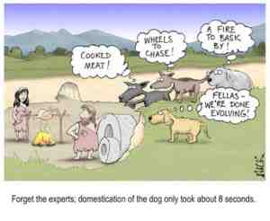 A word of caution, however; what do we mean by “domesticated”? In a most general sense: “no longer in its wild or natural state.” But, were our own ancestors back then, long before they built permanent houses for themselves, less “wild” than the wolves they associated with?… Is it not absurd to talk about the “domestication” of dogs by humans who had not yet any permanent domiciles (“domus”)?
