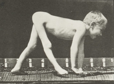 Uner Tan even pointed to the work of photographer Eadweard Muybridge, famous for his pioneering versions of moving pictures, in which he documented diverse people in everyday activities. Muybridge photographed an English child with a paralyzed leg who, like the last cluster of subjects examined by Tan, also walked on all four. I found the following short film clip by Keith Phillips on YouTube, based on Muybridge’s photos of the quadrupedal child: