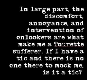 The problem with TS, as Hollenbeck describes, is not the urge to act or make noise; the disorder is not debilitating or progressive. In fact, many sufferers of TS find their compulsions waning with age and, unless they have another psychological condition (and many do, especially obsessive-compulsive disorder and attention deficit hyperactivity disorder), does not necessarily cause any cognitive or health problems. Rather, Hollenbeck (2003) tells us, ‘In large part, the discomfort, annoyance, and intervention of onlookers are what make me a Tourette sufferer. If I have a tic and there is no one there to mock me, is it a tic?’